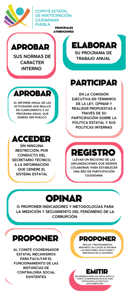 La Ley del Sistema Anticorrupción del Estado de Puebla define claramente las tareas y responsabilidades del Comité Estatal de Participación Ciudadana. En sus artículos 21 y 23, se detallan las funciones que este comité puede llevar a cabo para representar a la sociedad, promover la participación ciudadana y contribuir en la prevención y combate a la corrupción.